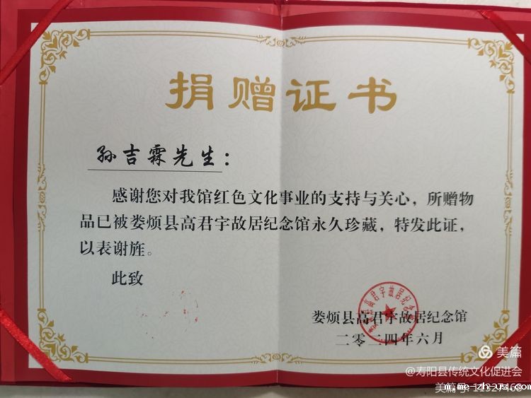 纪念馆馆长颁发《捐赠证书》,并表示一定要把这一珍贵的赠品摆挂在一个重要的位置。